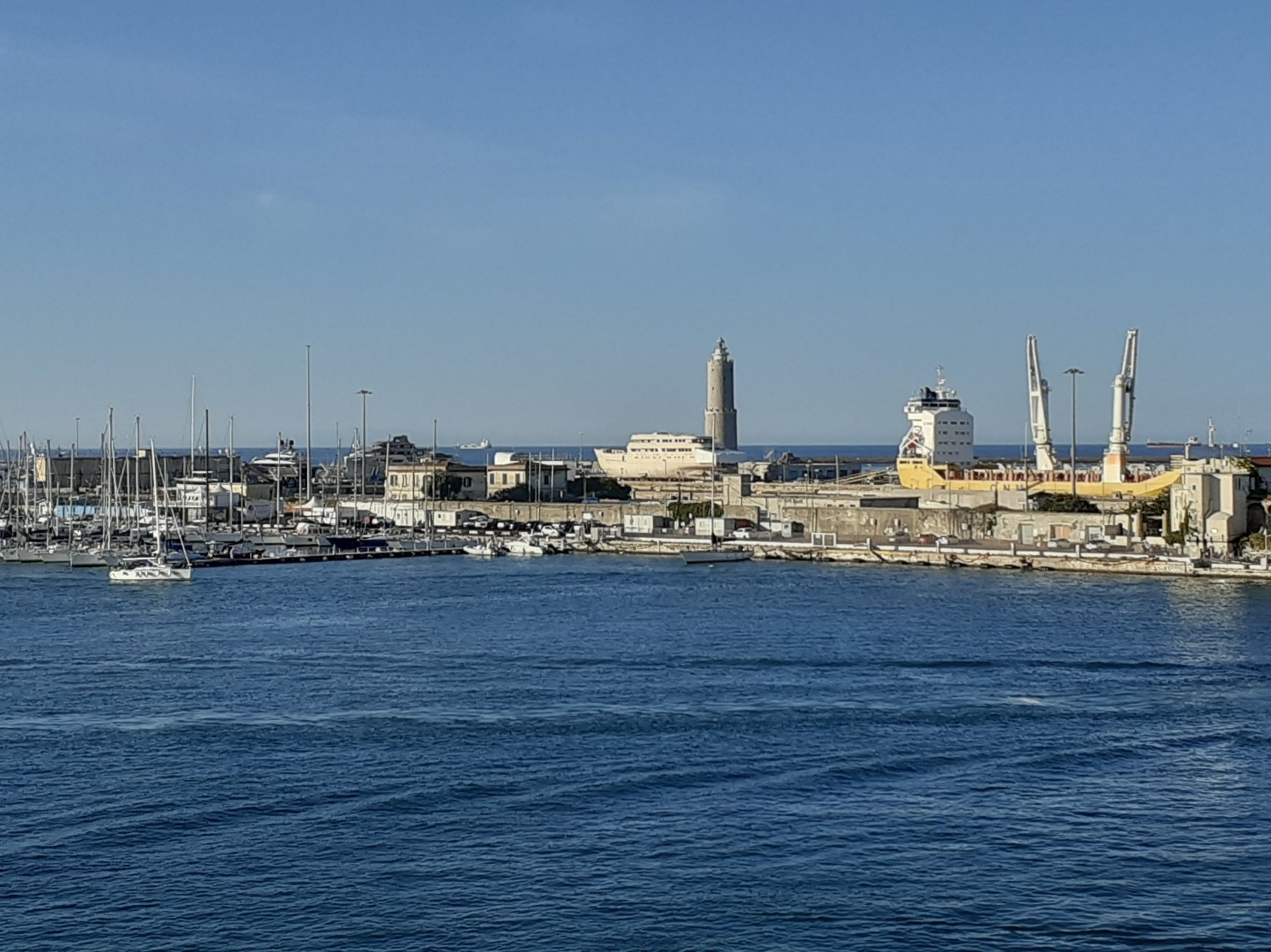 Pisa. Wir hatten die Übernachtung auf der Fähre gebucht. Die fährt morgens um 8.00 los. Da saßen wir ausgeruht beim Frühstück, weil wir nicht schon um 6.00 für den Checkin anstehen mussten.
