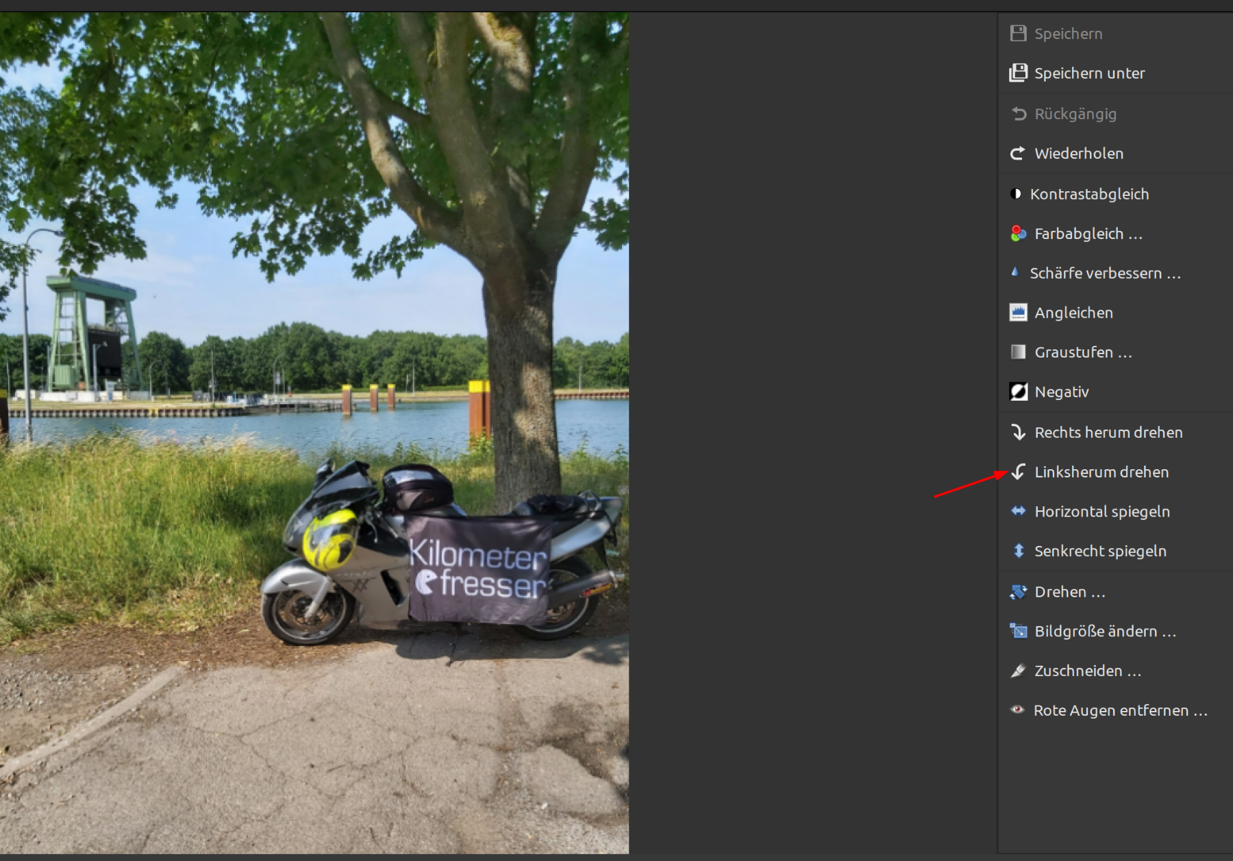 Bildbearbeitung öffnen, Bild laden und einmal links drehen und danach wieder rechts drehen Ergebnis: Bild unter neuem Dateinamen speichern.