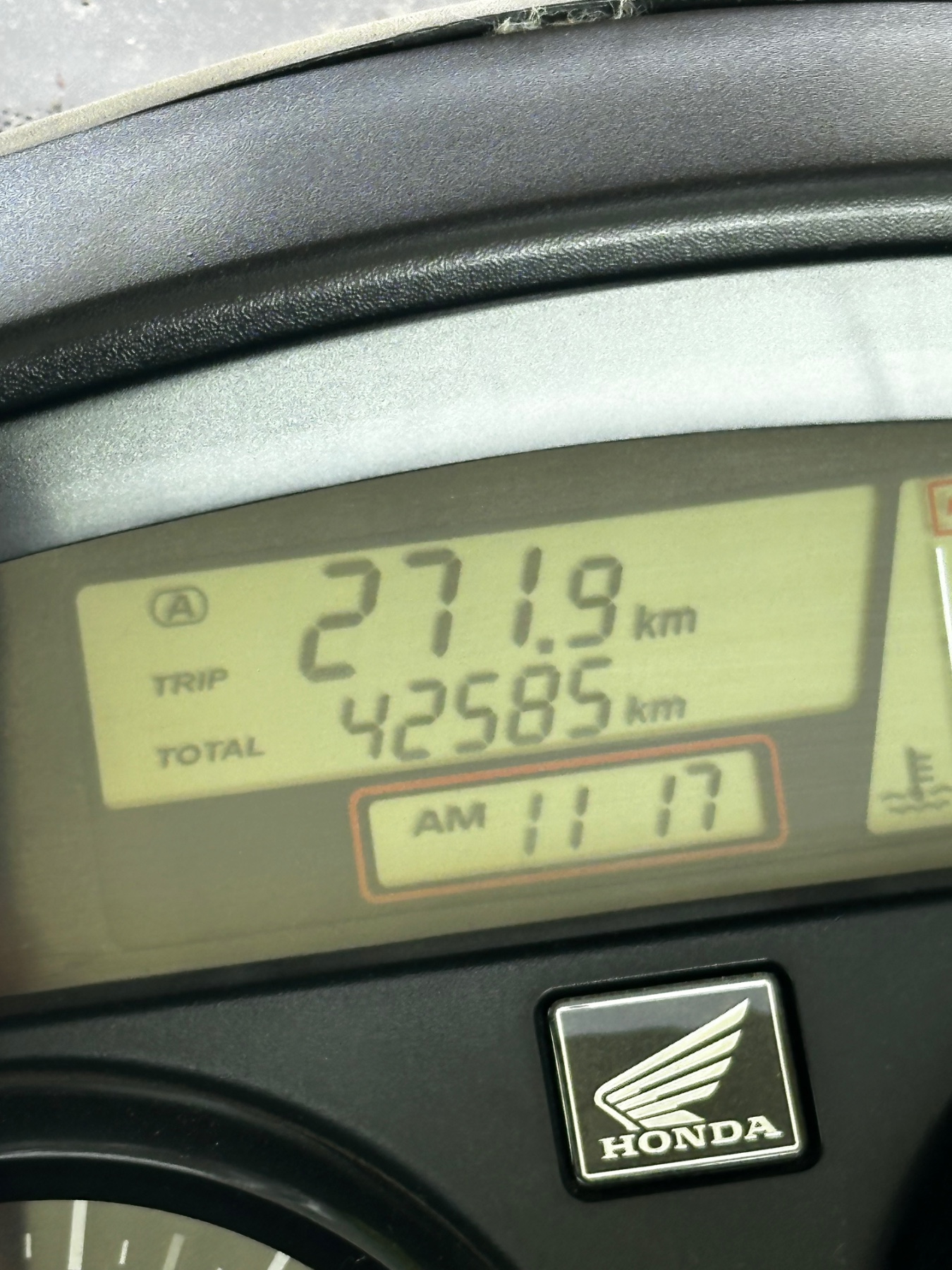 Der aktuelle Kilometerstand ist für die Africa Twin: 105034. Das bleibt sicher bis Montag so. Schaut etwas verschwommen aus, aber man kann die Zahl erkennen; finde ich.