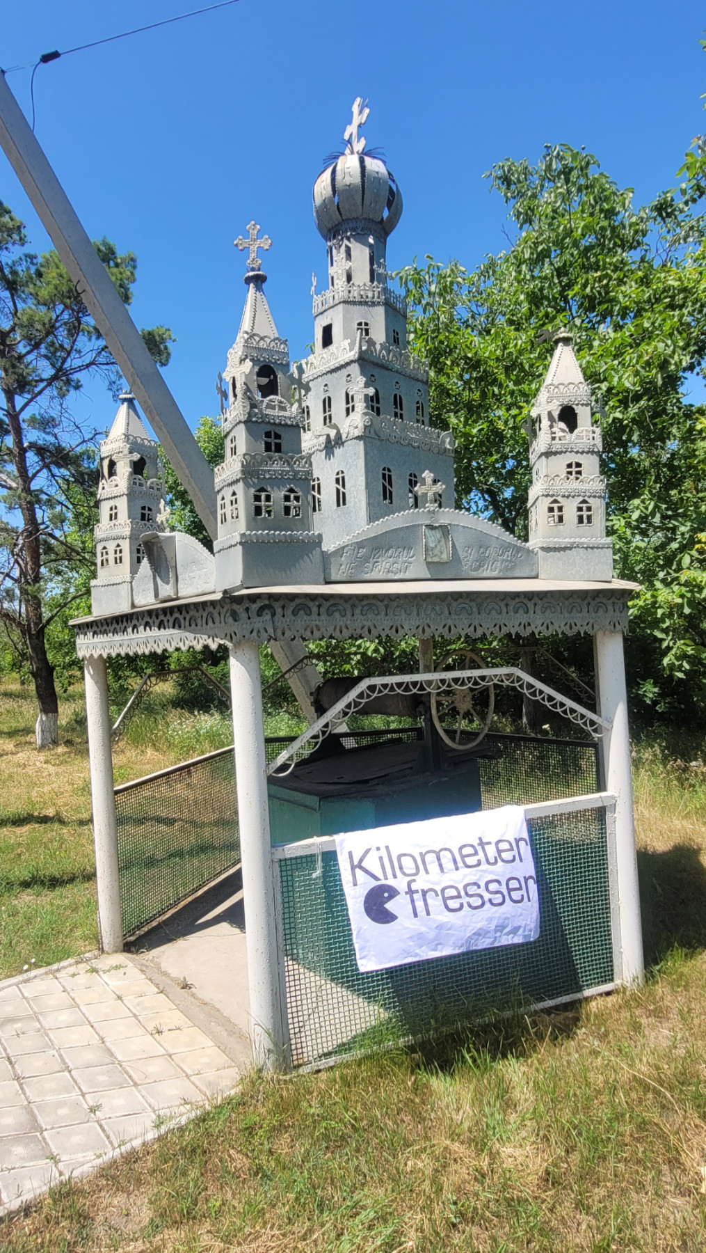 Brunnen mit aufwendiger Abdeckung on Form eines blechernen Schlosses bei Petresti, Moldawien